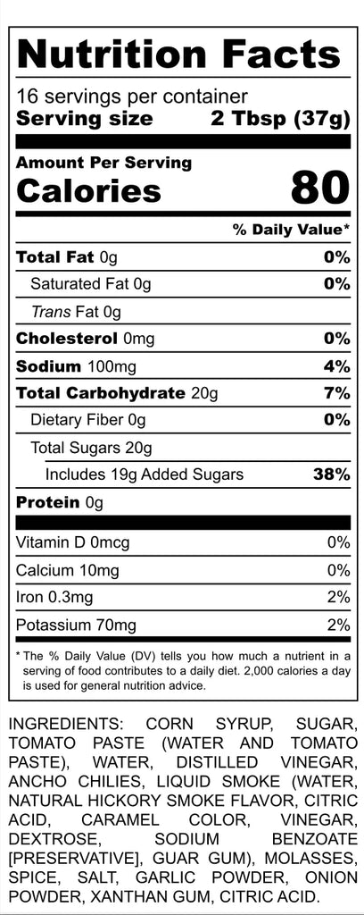 Contains: Corn Syrup, Sugar, Tomato Paste (water and tomato paste), Water, Distilled Vinegar, Ancho Chilies, Liquid Smoke (Water, Natural Hickory Smoke Flavor, Citric Acid, Caramel Color, Vinegar, Dextrose, Sodium Benzoate [Preservative], Guar Gum), Molasses, Spice, Salt, Garlic Powder, Onion Powder, Xanthan Gum, Citric Acid.
